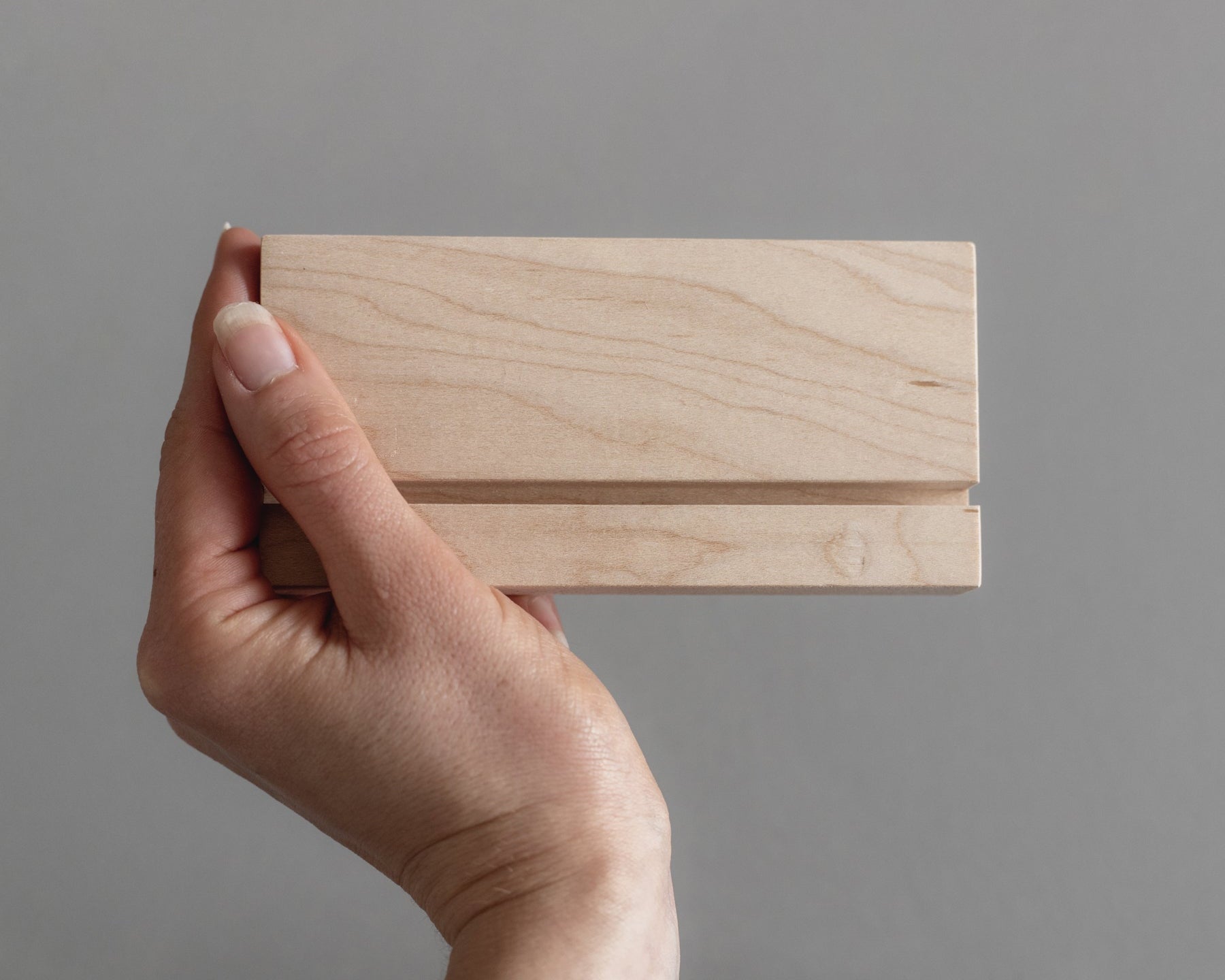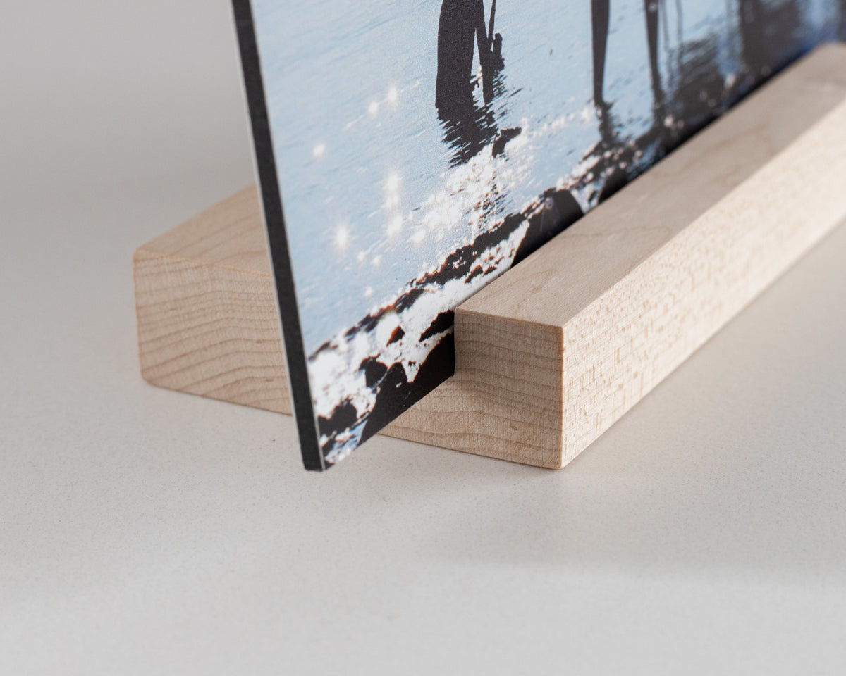 Onze fotostandaard van hout is gemaakt van massief, FSC-gecertificeerd esdoornhout uit Scandinavië. Elk stuk wordt met de hand vervaardigd in Nederland – met oog voor detail en vakmanschap. De fijne nerf en zachte afwerking geven de houder een rustige, tijdloze uitstraling, perfect passend in elk interieur.