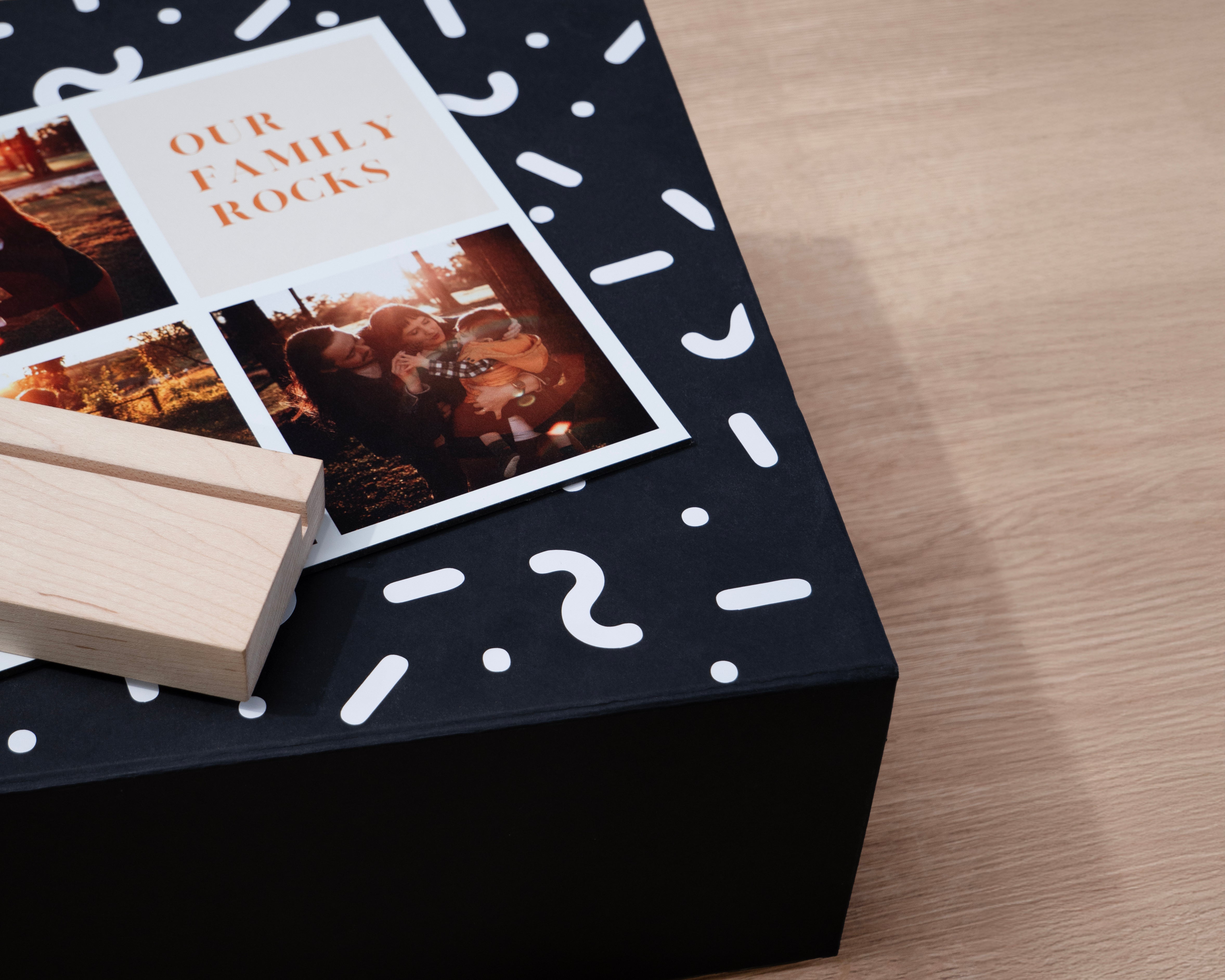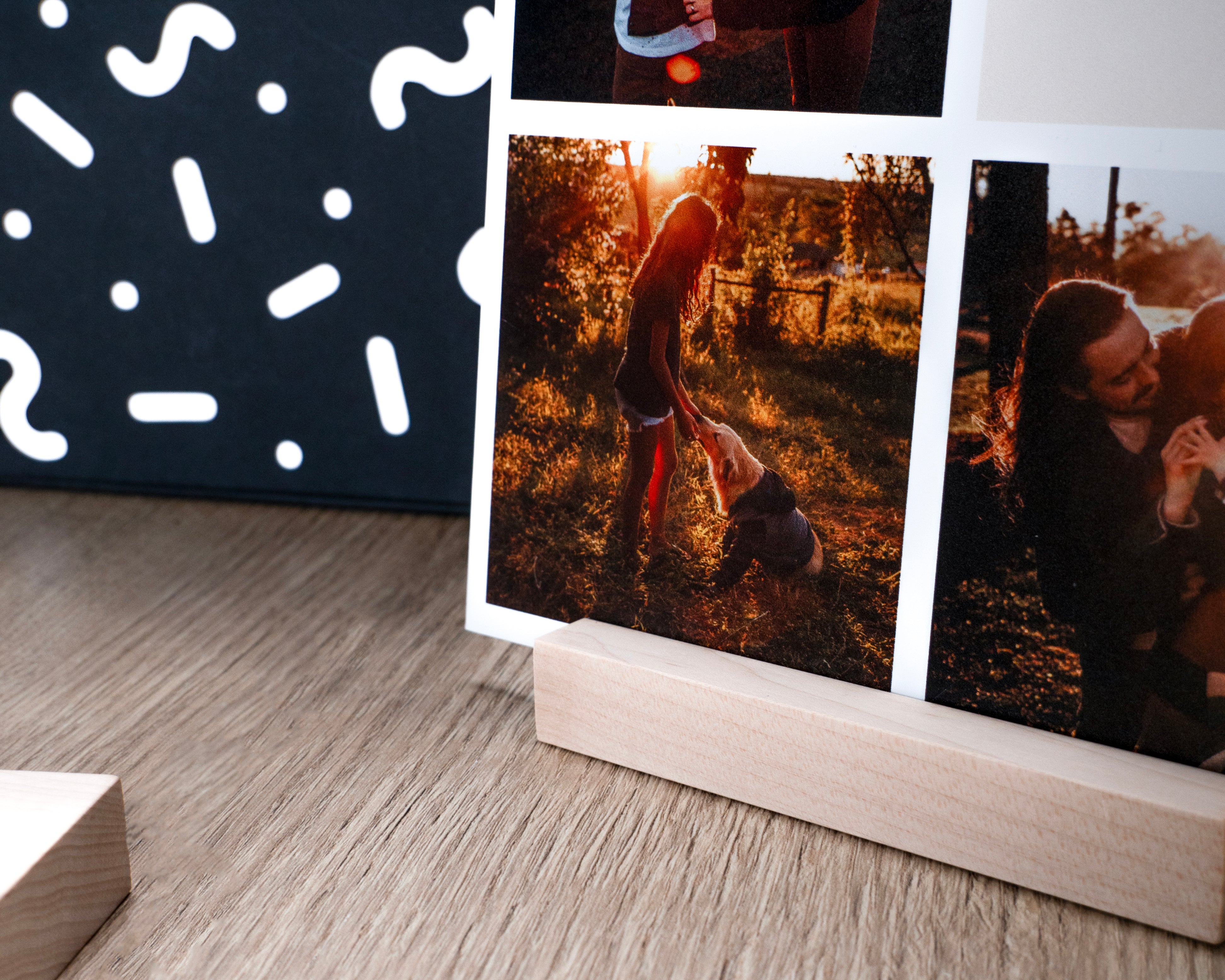 Jij maakt een collage met 4 foto's deze wordt verpakt samen met een houten fotohouder in de giftbox.